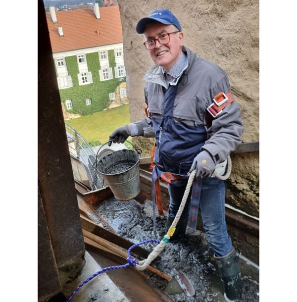 Säuberung der Regenwassertraufe im Sakristeibereich der Stadtpfarrkirche