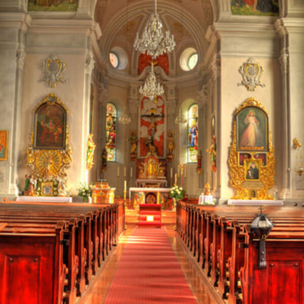 Betritt man die Pfarrkirche (Dombaumeister Matthäus Schlager, Weihe 1905) durch den gegenüber dem Pfarrhof gelegenen Eingang, leiten die Deckengemälde des Mittelganges durch das hohe Langschiff Richtung Hochaltar.