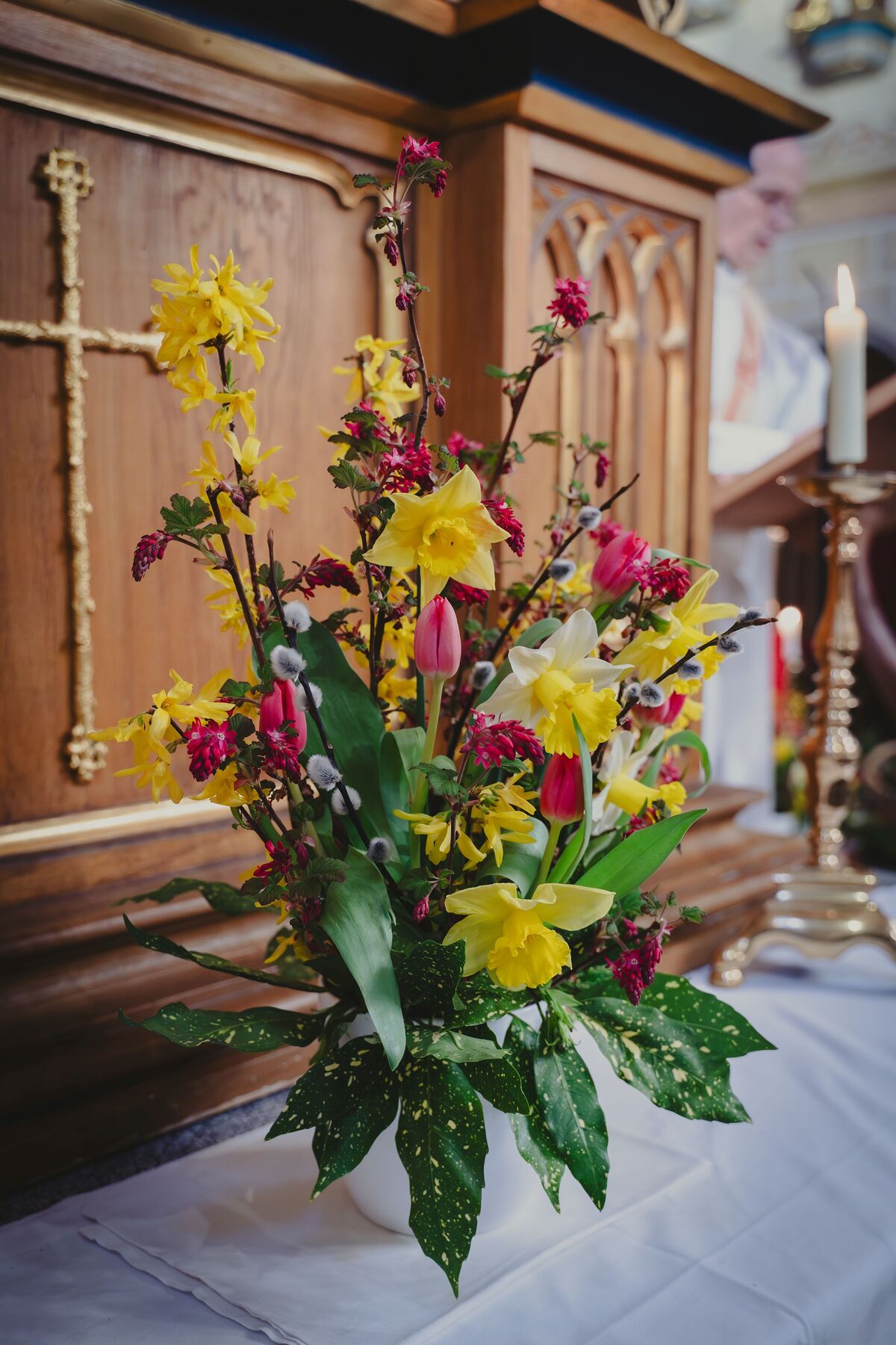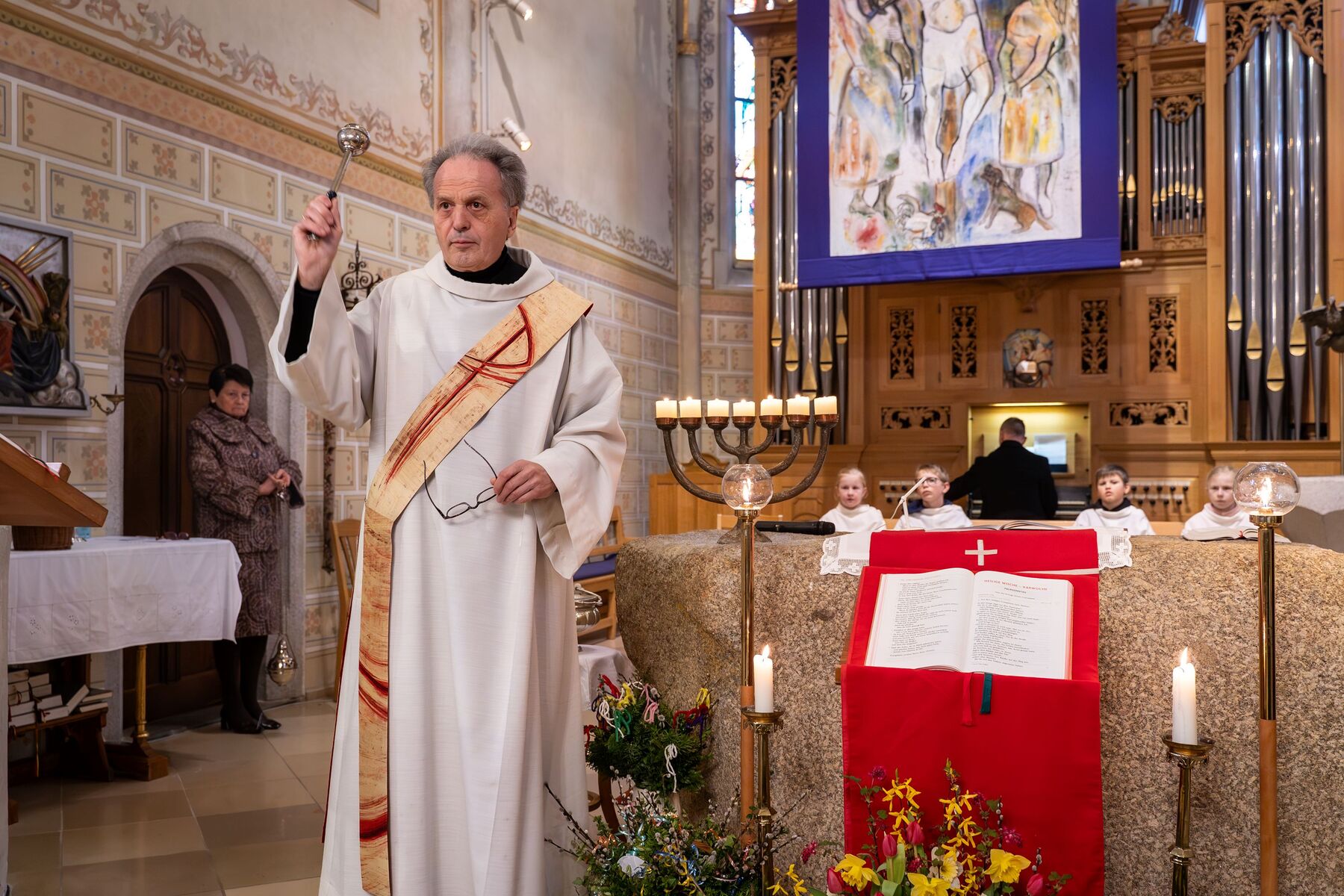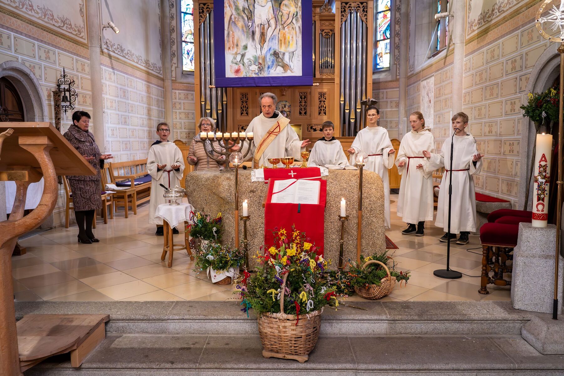 Witterungsbedingt entfiel heuer die Palmprozession am Palmsonntag, sodass die Feier in der Pfarrkirche gleich mit dem Einzug der Minis und dem liturgischen Leiter Diakon Johann Hagn begann.