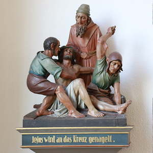 Die 51 Figuren der Kreuzwegstationen wurden als Kopien nach den Gemälden des Feuersteinkreuzweges aus Lindenholz geschnitzt.